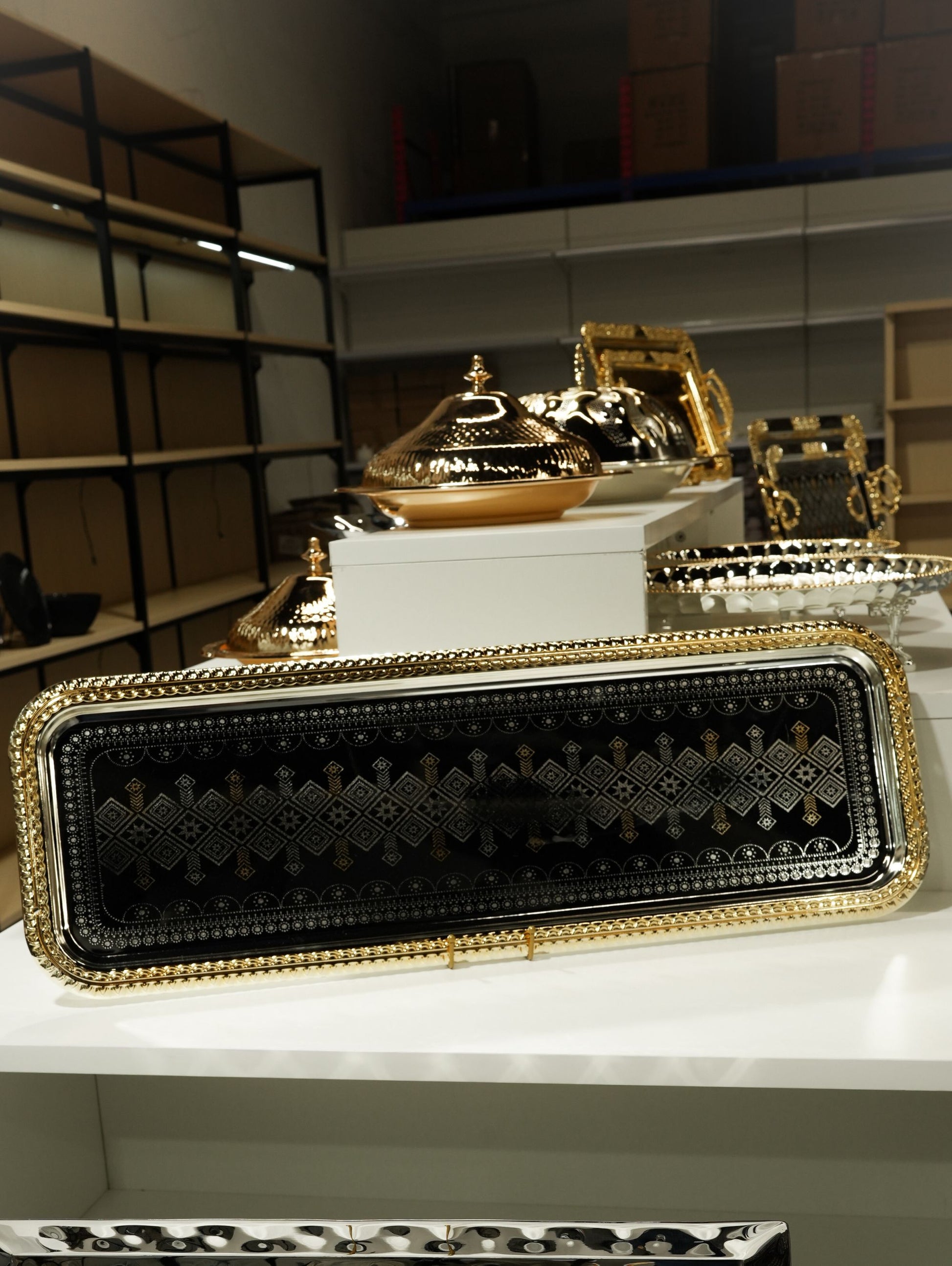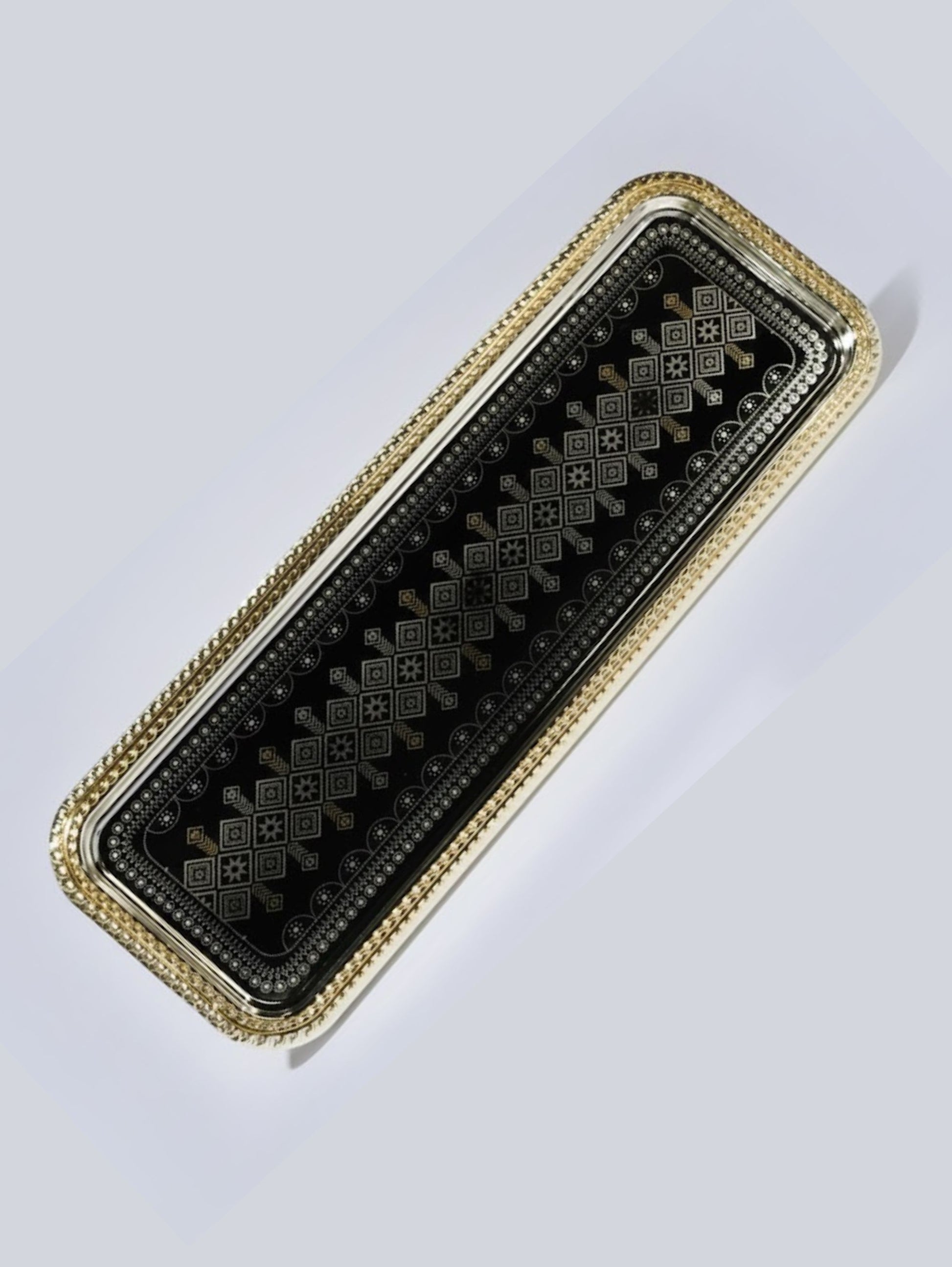 Elevate your hosting with the Cosmopolitan Geometric Long Serving Tray. This luxurious rectangular platter is designed to make a commanding statement on any bar, console, or dining table. It seamlessly blends classic opulence with a sharp, modern aesthetic. The interior boasts a striking geometric diamond pattern in sophisticated silver and black tones, providing a dynamic contrast to the heavy, textured gold-toned rope border that frames the entire piece. Ideal for serving cocktails, lining up decanters, or displaying prized decorative objects, this tray is the definitive choice for the contemporary, high-end home.
