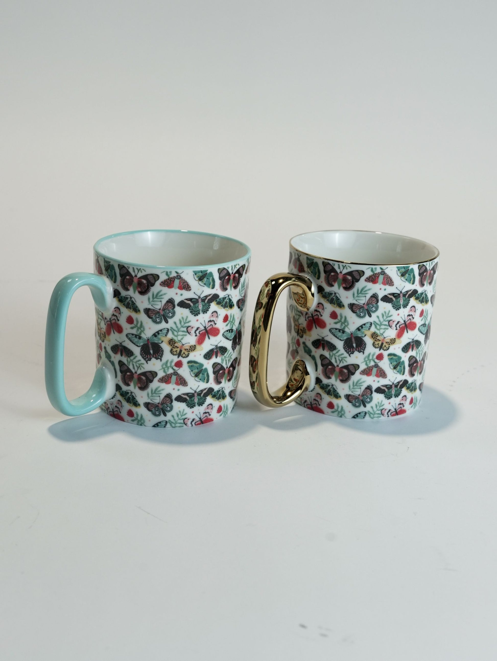 Elegant Porcelain Mug Set (450ml) - Butterfly & Moth Print with Gold & Light Blue Handles