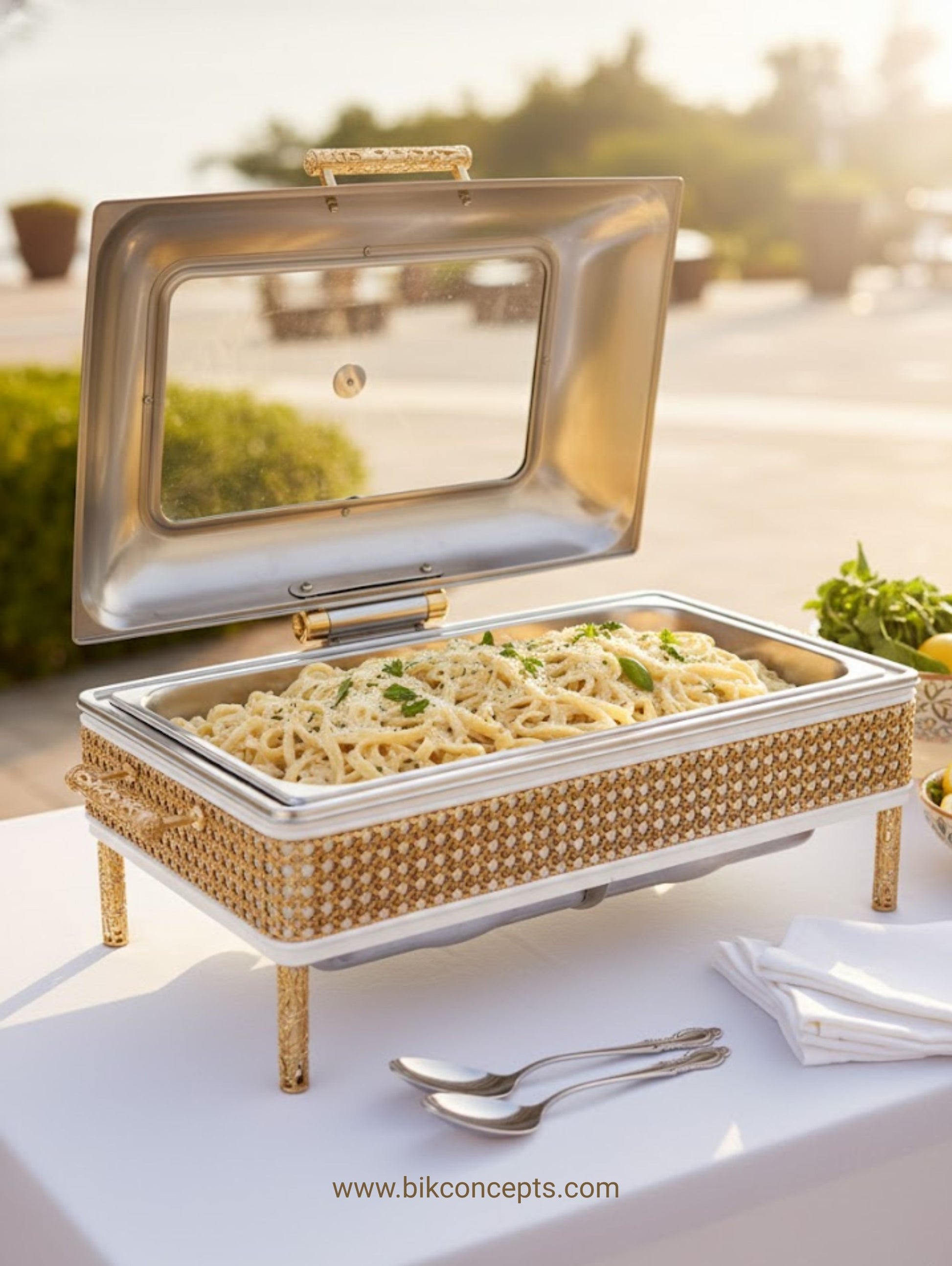 This chafing dish is more than a serving vessel—it is a reflection of impeccable taste. Crafted for those who appreciate the finer details, it adds a level of sophistication to any event, making each occasion memorable and effortlessly elegant.