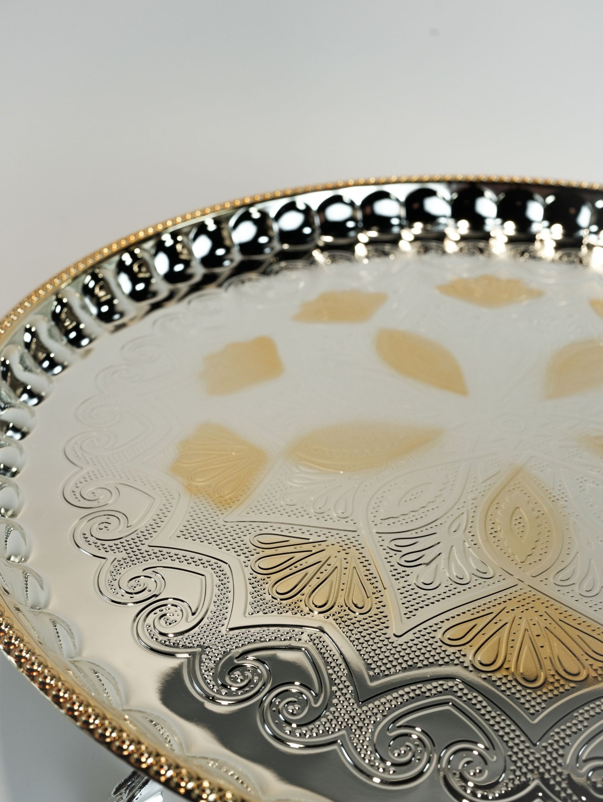 Elevate every moment of entertaining with the Regal Silver & Gold Serving Platter. Designed for the discerning hostess, this piece is the ultimate statement in luxury tableware, perfect for showcasing everything from holiday appetizers and pastries to a magnificent wedding cake. It features a brilliant mirror-polished silver finish that provides a rich backdrop for exquisite, deeply embossed golden floral blossoms and ornate scrolling patterns. Supported by sturdy, decorative silver-toned feet, this platter instantly transforms your buffet or dining table into a high-end, gallery-worthy display. Invest in the heirloom quality and magnificent aesthetic that will define your most important gatherings.