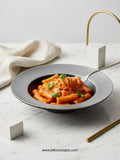 This 9.5-inch deep plate features a matte black interior and a textured silver-rimmed edge, ideal for serving elegant pastas, stews, or salads with flair. It brings depth, both literally and visually, to your dinner table.